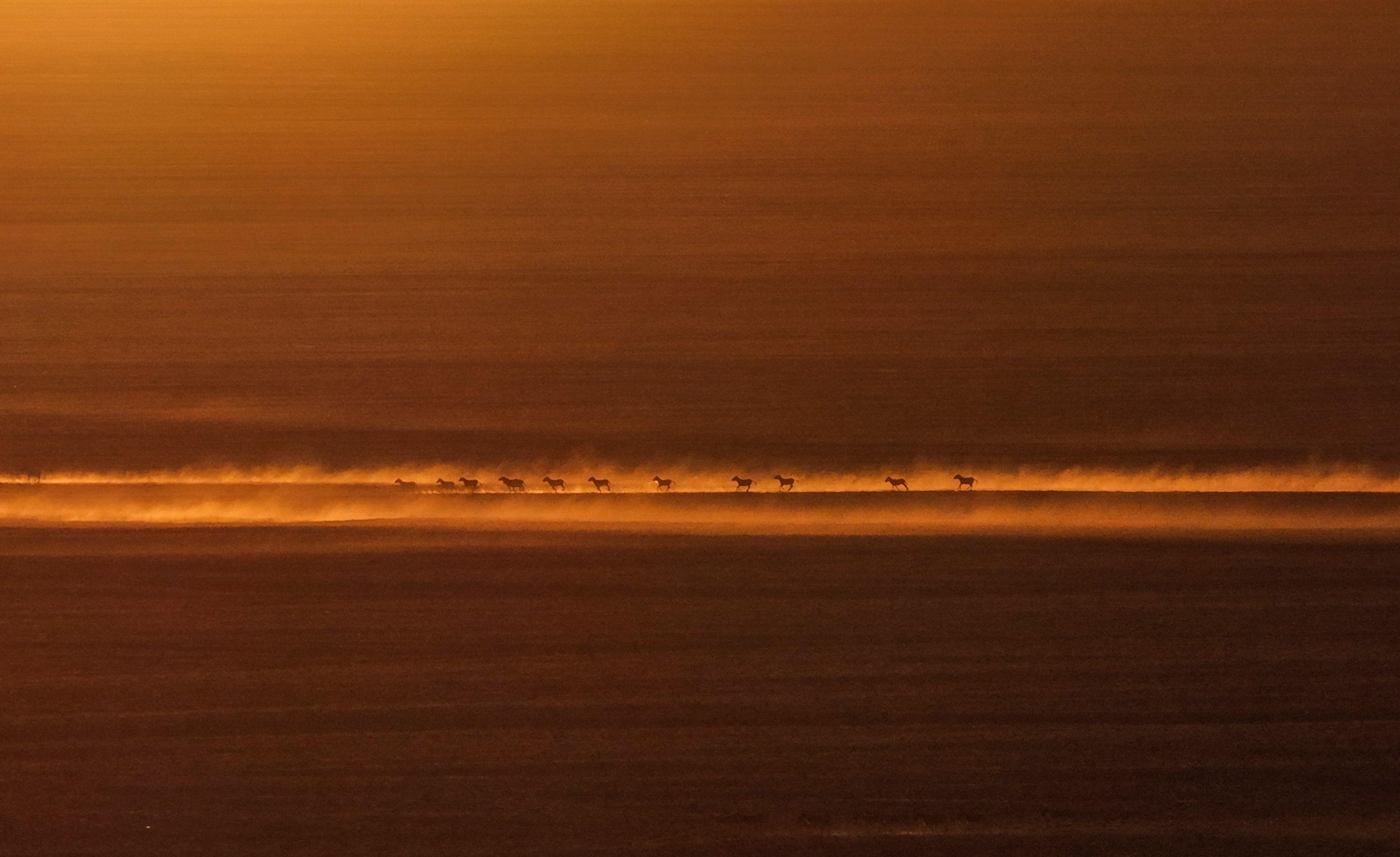 在阿尔金山国度级当然保护区,藏野驴驱驰在日出时的依协克帕提草原上(无东说念主机相片,12月9日摄)。新华社记者 辛悦卫 摄